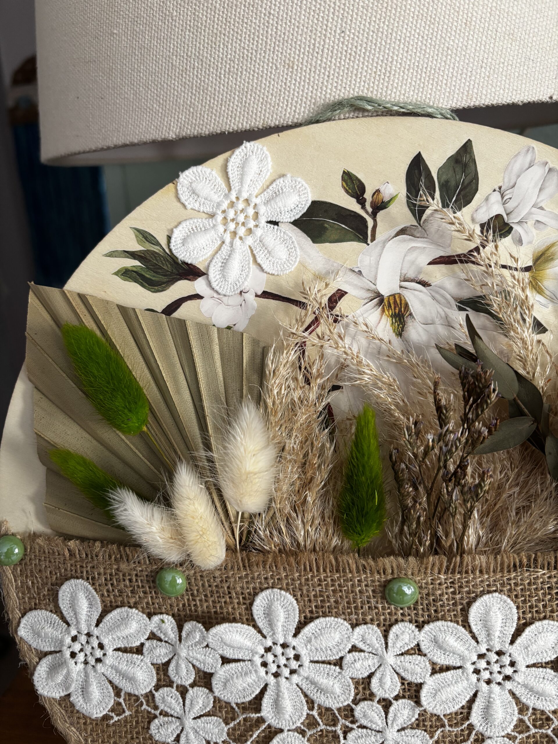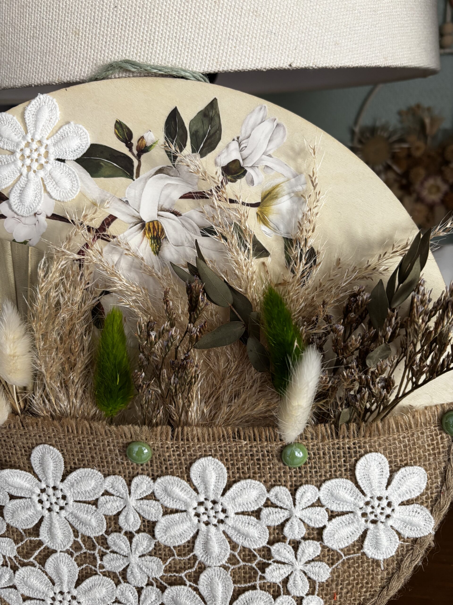 Décoration murale composée de jute, de dentelle, de demi-perles et de fleurs séchées pouvant être changées au gré de votre humeur !